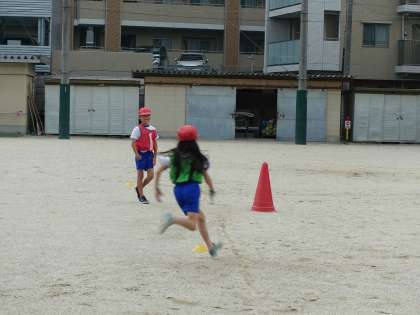 リレーの仕方に慣れ,確実にバトンパスをして相手チームと競走することを楽しんでいます。