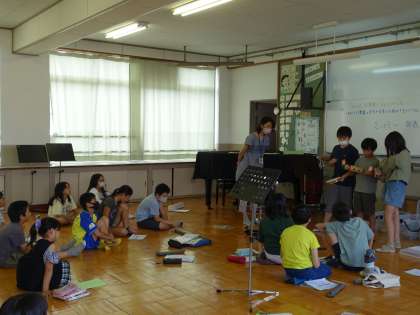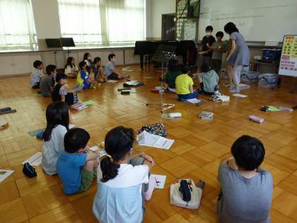 3人組になり、楽器の音色やその特徴と合うリズムパターンをそれぞれ選び、響きの組合せを確かめました。