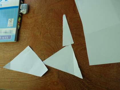 三角形や四角形の紙を2つに切って三角形や四角形をつくり、三角形や四角形について考えました。