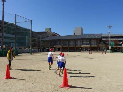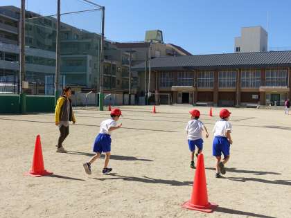 自分たちでリレーあそびを選び,走る順番や低い障害物を走り越える工夫をして,相手チームと競走することを楽しむみました。