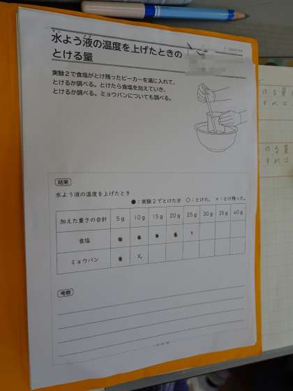 食塩やミョウバンの溶ける量を増やす方法について計画を立て、条件を整えて調べました。