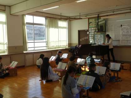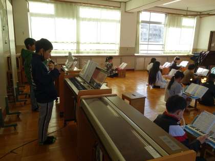 アとイの曲想の違いを感じ取りながら、鍵盤楽器のパートの特徴をつかみ、演奏したり主旋律と鍵盤楽器のパートを重ねたりしました。