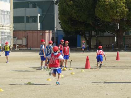 走る順番を固定し、バトンパスの仕方を工夫して記録に挑戦しながら、相手チームと競走することを楽しみました。
