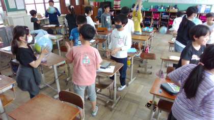 社会科「わたしたちの国土」の学習で、地球のビーチボールを使ったゲームを通して、地球のどのくらいの面積が海で、どのくらいの面積が陸かを考えました。