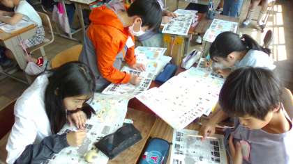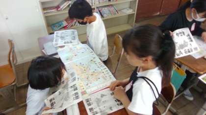 社会科『世界の中の国土』の学習で、国名や国の場所を協力して地図帳で調べました。