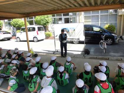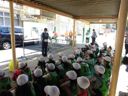 自転車安全教室がありました。右京警察の方の説明をしっかり聞いて、このあと実際に自転車に乗ってコースを走ります。