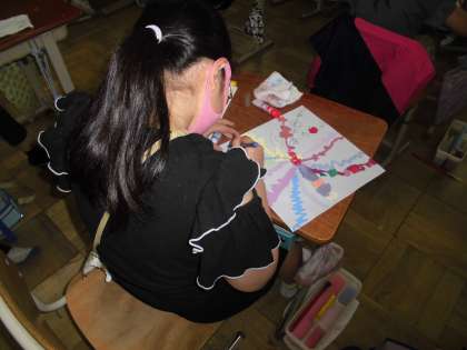 図画工作の時間に基本的な絵の具の使い方を学習した後に「まほうのハンカチをえがこう」とハンカチの色んなもようと線を考えて画用紙に表しています。完成した作品を見ると、ひとつとして同じデザインはなし!個性あふれるアート作品が仕上がりました。休日参観の時に掲示しますのでぜひご覧ください。