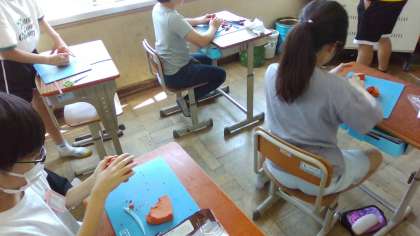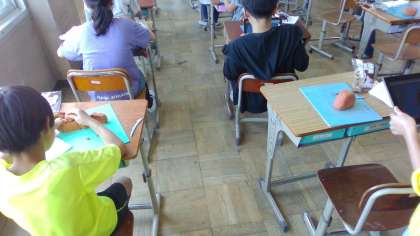 図画工作「けずって見つけたいい形」では、木彫風粘土を彫ったり、削ったりして出来てきた形のよさや美しさを感じ、イメージを膨らませました。