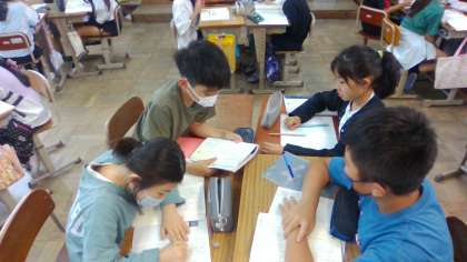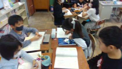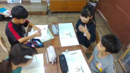 国語科「きいて きいて きいてみよう」では、話し手、聞き手、記録者の役割を分担してインタビューの仕方を学んでいます。第1回目は、すきなことについて、第2回目は、もやもやした時のすっきりする方法について話し合いました。記録者の報告の際には、クラスの半分以上の子どもたちが積極的に発表していました。