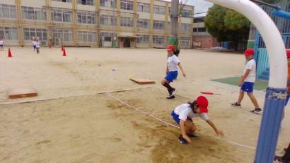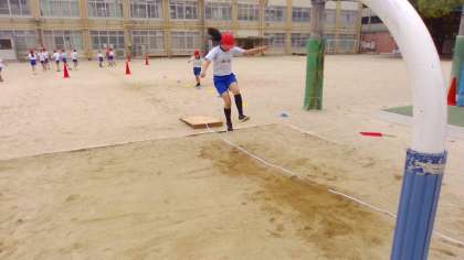 体育科「走り幅跳び」では、目線や踏み切り方などを工夫して記録に挑戦しています。