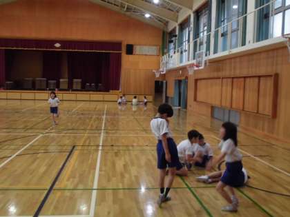 体育の表現運動の学習です。音楽に合わせて表現する動きをグループで確認しています。