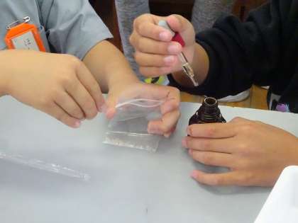 ごはん粒を水や唾液と混ぜてつぶします。