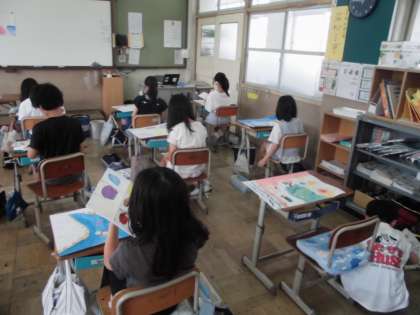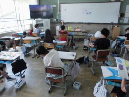 図画工作科「まぼろしの花」の花を描いています。丁寧に下書きをし、絵の具を塗っていきます。