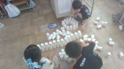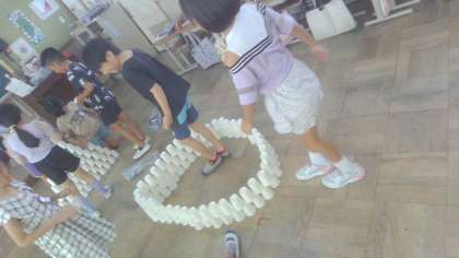 紙コップを使って、いろいろな遊びを考えました。並べたり、積み上げたりして楽しむことができました。