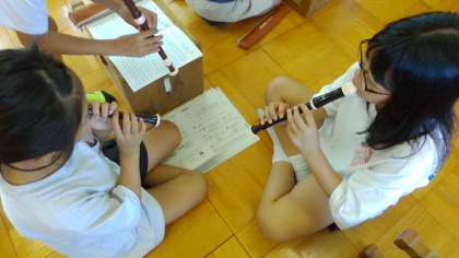 リコーダーで「いつも何度でも」のらr得るように演奏をしています。徐々にまとまったメロディーが奏でられるようになってきました。