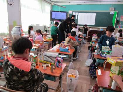 箱の形や色もよく見て、並べたり、積み重ねたりして