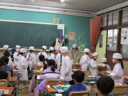 給食当番が教室まで給食や食器を運び、
