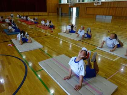 体育館で体ほぐしの運動をしています。