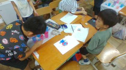 図画工作「カラフルいろみず」の学習で造形あそびを楽しみました。班でアイデアを出しながら活動していました。