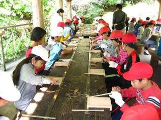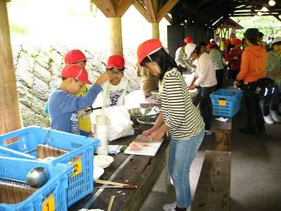 秋晴れのよい天候に恵まれ,4日間楽しい格闘となりました。山の家で作った竹ばしを使い,宿泊中の食事は手作りの竹ばしを使いました。野外炊事は”やきそば”や”シチュー・豚汁などグループごとに作ったメニューでバイキング”自由におかわりをしておいしく頂きました。