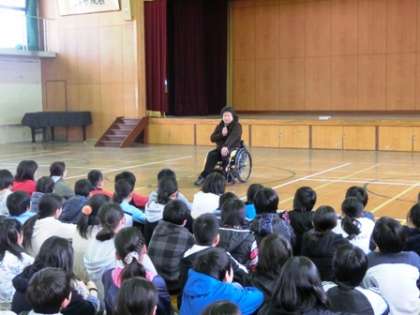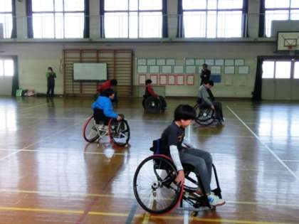 12月4日に3年生と6年生が車椅子の体験学習を行いました。車椅子バスケットボールの選手に来ていただき,実演をまじえながら車椅子バスケットボールについての説明を聞きました。その後,6年生は実際にバスケット用の車椅子に乗って,直進やターン,後ろ向きの走行などに挑戦しました。後ろ向きの走行はとても難しく,思い通りに操作できないことにみんな苦労していました。体験の後は車椅子バスケットボールの選手の方から,事故に遭って車椅子の生活になった時の気持ちや,バスケットボールに打ち込むようになったときの気持など,これまでの体験談を聞きました。子どもたちにとっては,障害者スポーツを身近に感じる大変よい機会となりました。