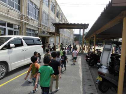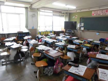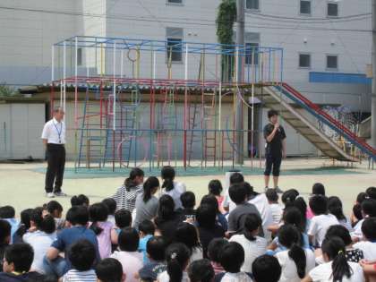 今回は緊急地震速報を聞き,適切な行動と安全な避難ができるように訓練を行いました。子どもたちは,放送による合図や指示,また,指導者の指示に従って,整然と行動することができていました。