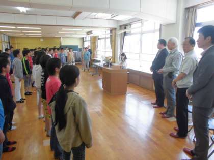 株式会社三橋製作所の私募債による利益を,滋賀銀行九条支店からオルガンと書画カメラとプロジェクターという形で寄贈いただきました。本日は,贈呈式にて6年生がお話を賜り,歌声のお返しをしました。