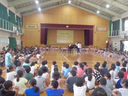 7月のジョイフル集会は「U&I]の全校合唱と,拍の学習をしました。「U&I]は,6年生の副次的な旋律も加わり,主旋律を引き立たせる美しい合唱になっていました。拍の学習では,手拍子を使って,2拍子と3拍子のちがいを実感することができました。