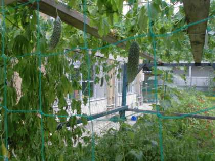 上からミニトマト,ピーマン,ゴーヤです。学校園で育てた夏野菜たちがたわわに実っています。