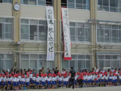 いよいよ運動会が始まりました。天候を心配していましたが,雨も降らず晴天の下行うことができています。しっかりと入場行進ができ,選手宣誓も格好よく決まりました。