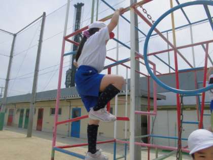 総合遊具での遊び方を学びました。安全に遊ぶために,「3点で体を支えること」「親指でしっかりつかむこと」などを確認しました。楽しそうに仲よく遊ぶことができました。