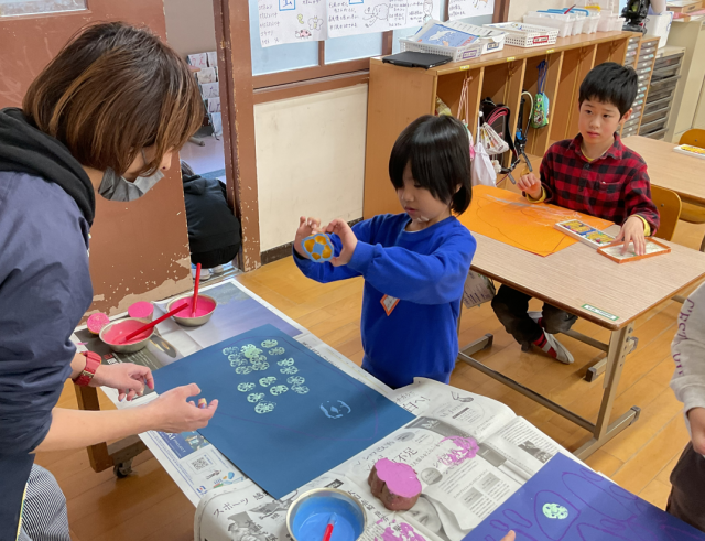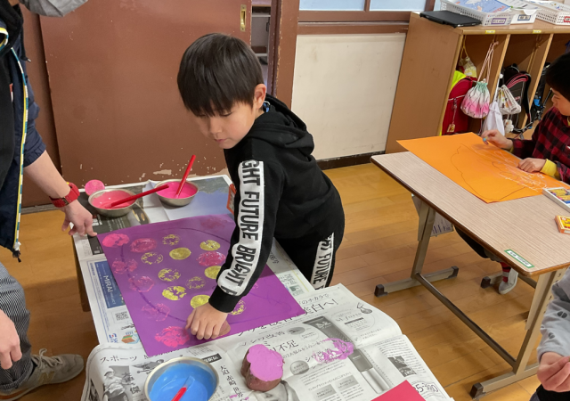収穫した大きなおいもをパスで描いて、その中をスタンプ!