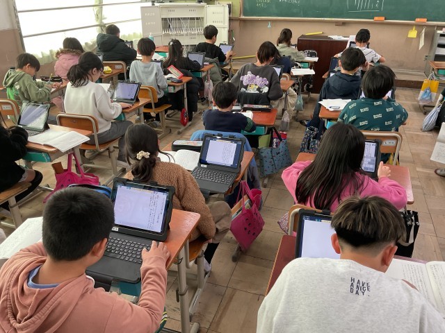 ロイロノートを使って共有します。頑張って文字を打っているところです。