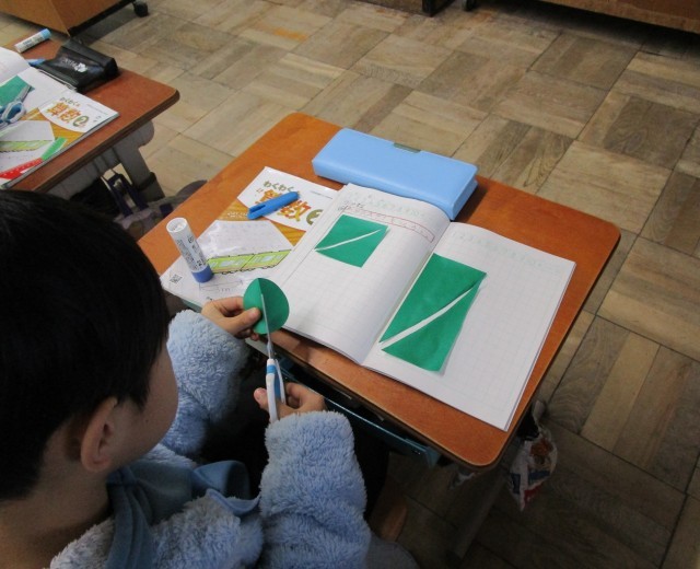 正方形・長方形・円の色紙を元の大きさの半分に切りました。