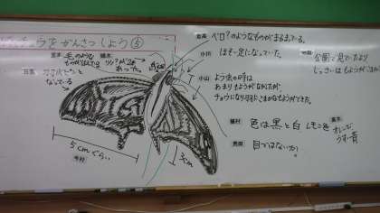 「幼虫とは違って翅に模様がたくさんある。」や「頭にツノみたいなのが2本あるな。」「幼虫にはなかった脚があるぞ」今までとは違う姿に夢中で観察していました。