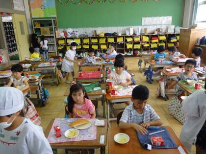 給食当番にも慣れてきた子どもたちです。