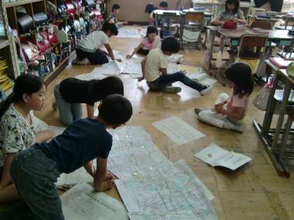 と班で話し合いながら地図を作っていくと梅津の町の様子が少しづつ見えてきました。