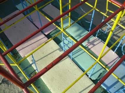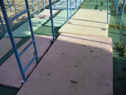 その遊具を「より安全に」使えるようにと,プールで使っていた大型のビート板を所々に敷きました。