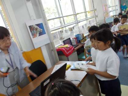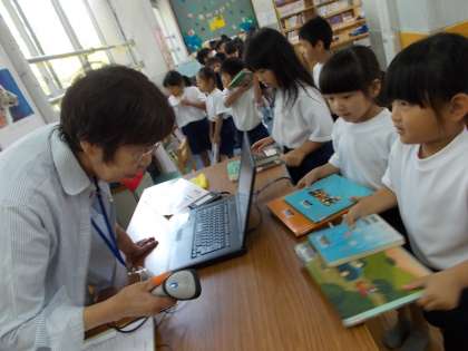 学校司書と短い会話をしながら,本を借りている1年生です。