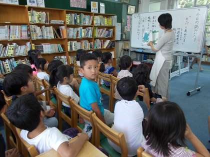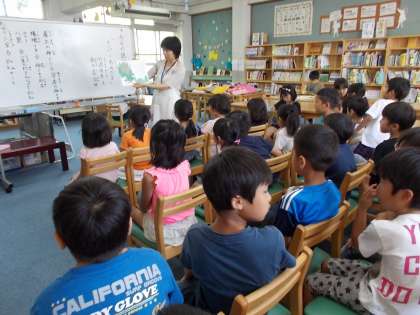 中間休み,ボランティアの角谷さんに読みがたりをしてもらいました。1,2年生が30人ほどきました。