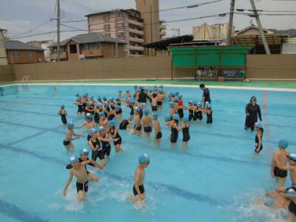 入水して指導する者は1名です。基本的には全体指導者・プール上からの監視 者・入水指導する者と3人以上の体制をとります。