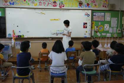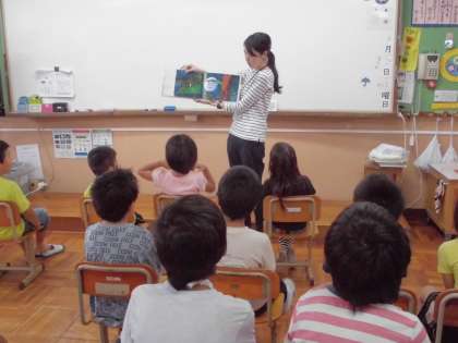 水曜日の朝は古川先生に「教室はまちがうところだ」,石田先生に「はらぺこあおむし」を読んでもらいました。