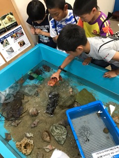 タッチプールで実際に生き物に触れるコーナーが大人気でした。やっぱりなんでも「やって」みたいものですね。