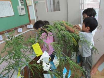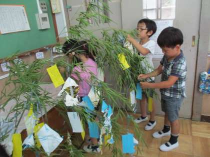 短冊の他に,図工の時間に作った飾りもつけて,七夕の歌を歌いました。雨雲のせいで織姫と彦星は出会えなかったかもしれませんが,1年生は七夕を楽しみました。