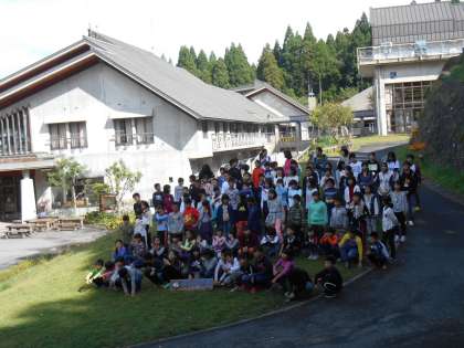 今日は朝から良い天気に恵まれ、山の家の本館と宿泊棟をバックに全員写真を撮りました。
