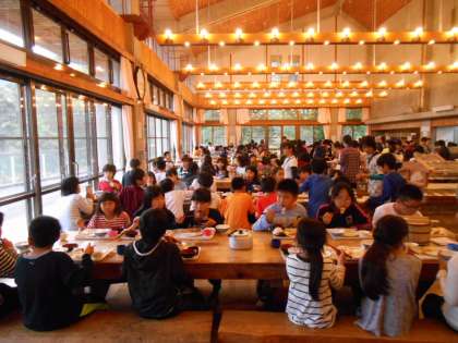 登山の後、各組に分かれて明日のキャンプファイヤーの練習などをして夕食をとりました。みんなの食欲にはびっくりです。たくさん食べて、明日のクライミングやアスレチックに備えたいと思います。夜の天体観測は、残念ながら曇りのため、ビデオ鑑賞になりました。明日キャンプファイヤーの後の星空を期待します。