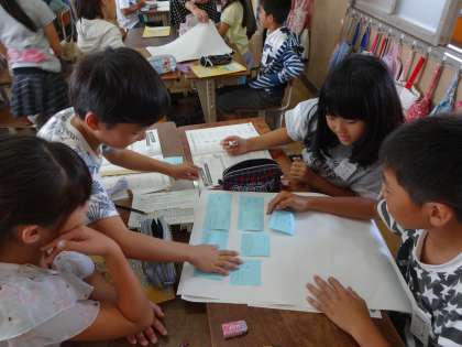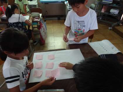 夏休みに自分たちが取り組んだエコライフチャレンジをふり返り,できていたことと,できていなかったことを付箋に書いて交流しました。そのあと,似ているものをまとめ,グループごとにチャレンジ目標を決めました。