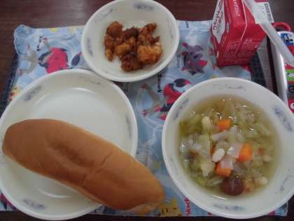 給食の献立は「味付けコッペパン・たらのアングレス・野菜のスープ煮」で,牛乳の音を見つけた子,パンとの組み合わせでたらのアングレスを食べておいしいよと教えてくれた子などみんなでたのしく食べる様子がうれしかったです。野菜のスープ煮には,ミックスビーンズが入り,豆の種類を紹介していると,大豆と手ぼう豆を見分けるのが上手になった子,味の違いに気づいた子,野菜のスープ煮のうまみはチキンスープなんだよということなど給食の話題にも多くふれた時間になりました。