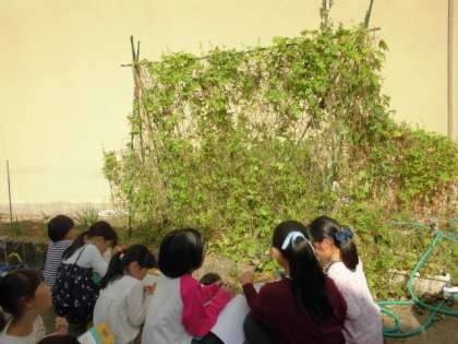 ツルレイシとさくらを中心に観察していましたが,ものさしで大きさを図りながら,前回の記録と比較していました。