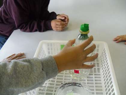 中の空気の体積はどうなるのかを実験しました。